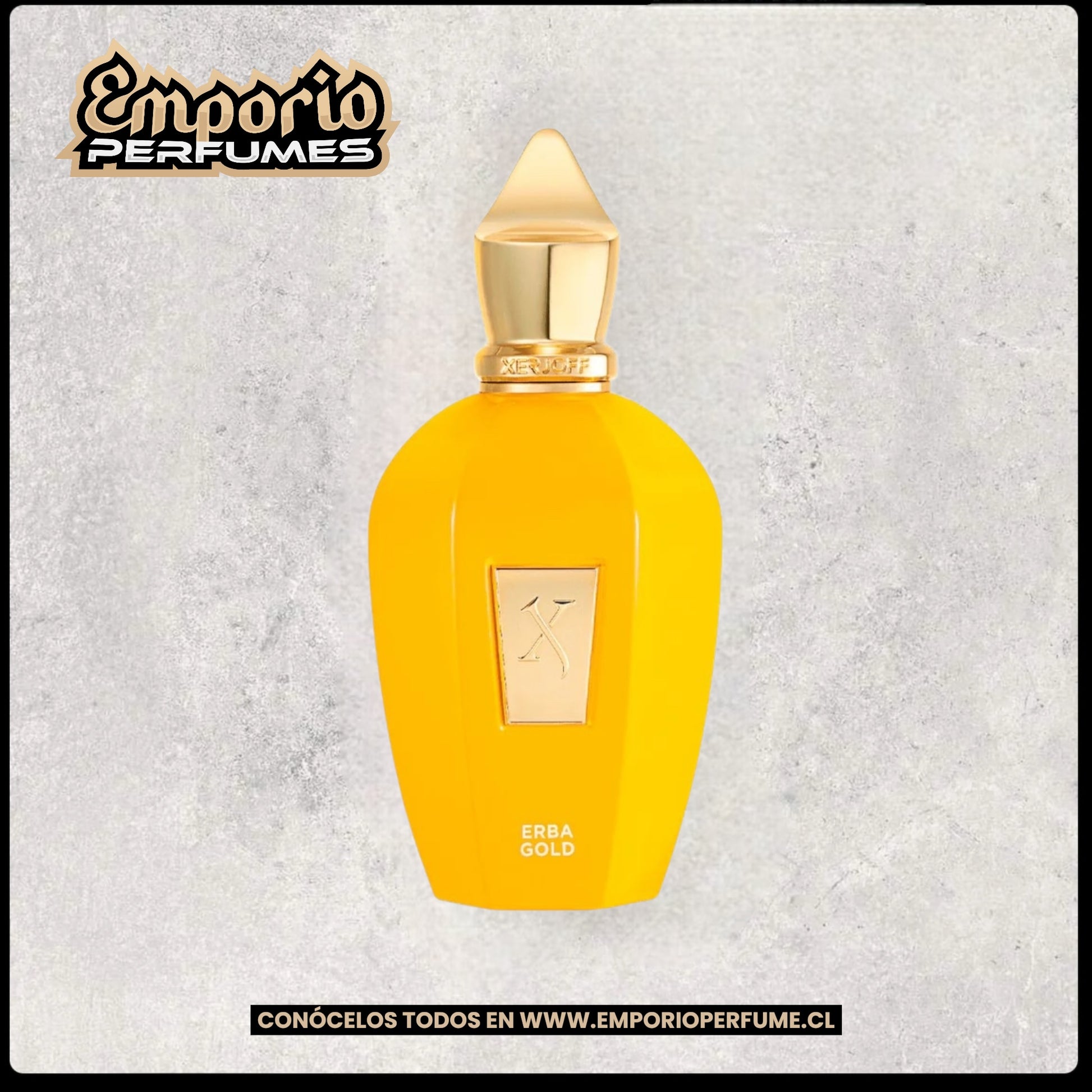 Erba Gold de Xerjoff es una fragancia de la familia olfativa para Hombres y Mujeres. Erba Gold se lanzó en 2016. Las Notas de Salida son naranja brasileña, limón siciliano (lima siciliana), bergamota de Calabria y jengibre; las Notas de Corazón son melón, pera, manzana verde, canela, cardamomo guatemalteco y clavos de olor; las Notas de Fondo son almizcle blanco, vainilla de Madagascar, ámbar y notas amaderadas.